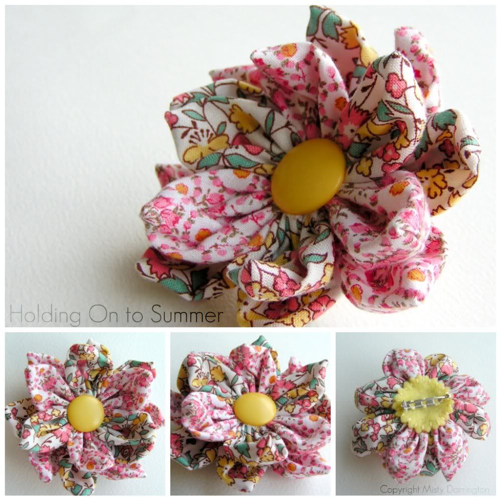 I've been collecting different tutorials for a variety of jewelry and accessories that use fabric. Most of them are gathered and shared by Tip Junkie. A fantastic blog to follow!! Yesterday, I made this flower brooch based on a tutorial by Dawn at "Crochet & Sweet, Simple Things", here. I've used cheery florals, one a vintage calico and the other a new "feedsack" print. I think there will be more of these for sure. It's super easy and a great project to have ready to take along in the car. This would also make a great hair clip. I went with a pin backing but will probably do some hair clips as well.